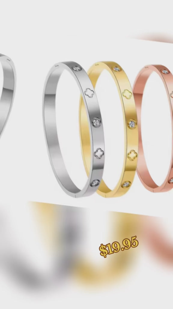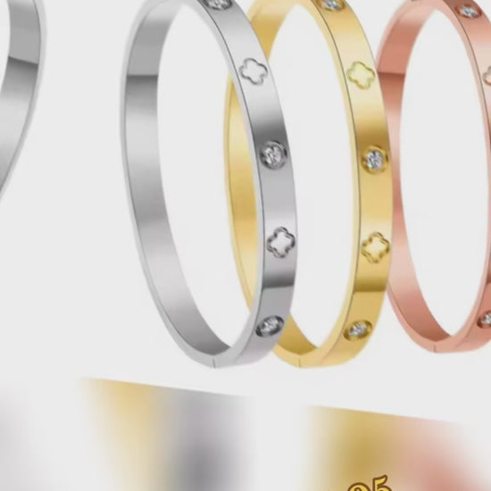 Beautiful polished bangle bracelet with cloverleaf design and zirconias. A nice gift for birthday, communion or wedding.